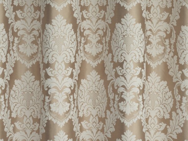 Brokát, török származású, egyszínű nyomott mintás és barokk mintás díszfüggöny. Kímélő mosás 30 C fokon, vasalás 120 C fokon javasolt. Tisztítása során 1% méretcsökkenés várható vízszintes irányba és 4% függőlegesen.