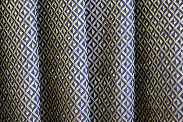 Királykék alapon arany háromszögmintás, 3D hatású dekorfüggöny. Mosás 30 C fokon, vasalás 120 C fokon javasolt. Anyag típus: dekoranyag