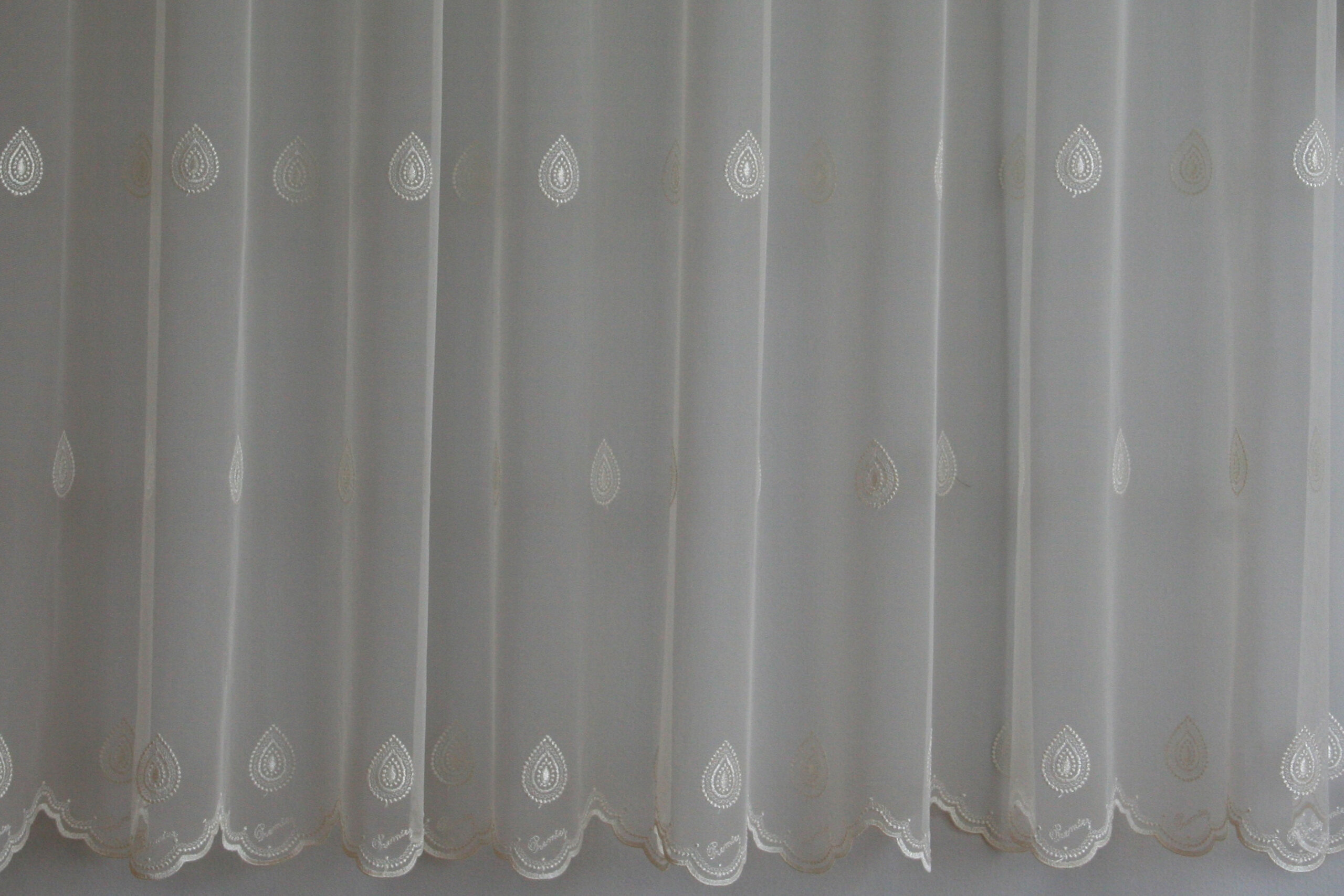 Hímzett, szórt cseppmintás, tüll, fehér, fényáteresztő függöny. Hullámos aljú. Kímélő mosás 30 C fokon, vasalás 120 C fokon javasolt. Hímzés 107 cm-es magasságig. Anyag típus: Hímzett tüll