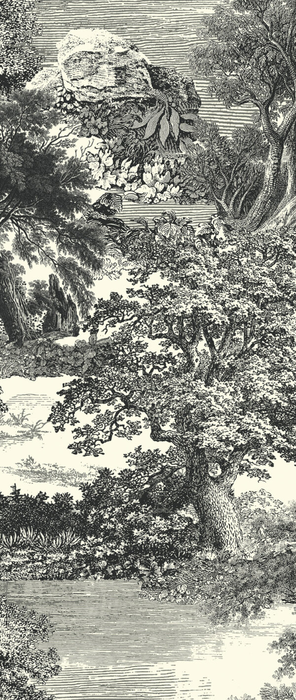 Romantikus angol illusztráció hatású, tájképet ábrázoló tapéta. A mintás tapétákhoz bármilyen színben harmonizáló minta nélküli tapétát remekül párosíthatunk.
