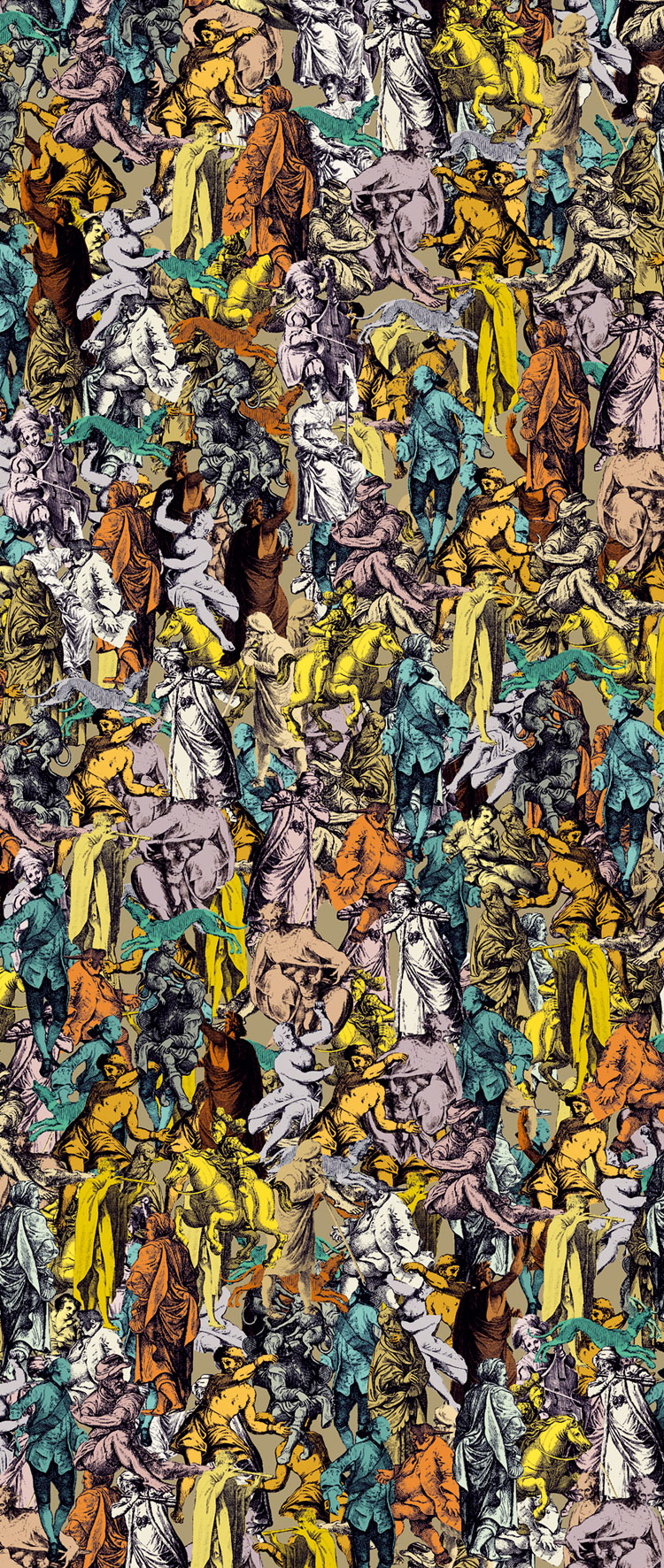 Különleges, színes figurákból álló illusztráció mix. A mintás tapétákhoz bármilyen színben harmonizáló minta nélküli tapétát remekül párosíthatunk.