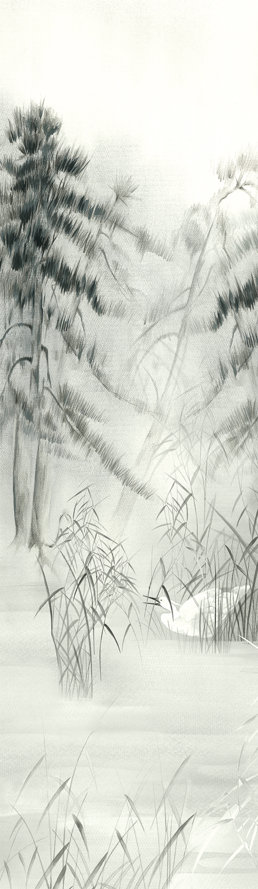 Különleges, japán festmény hatású, vízi madarakat ábrázoló tapéta. A mintás tapétákhoz bármilyen színben harmonizáló minta nélküli tapétát remekül párosíthatunk.